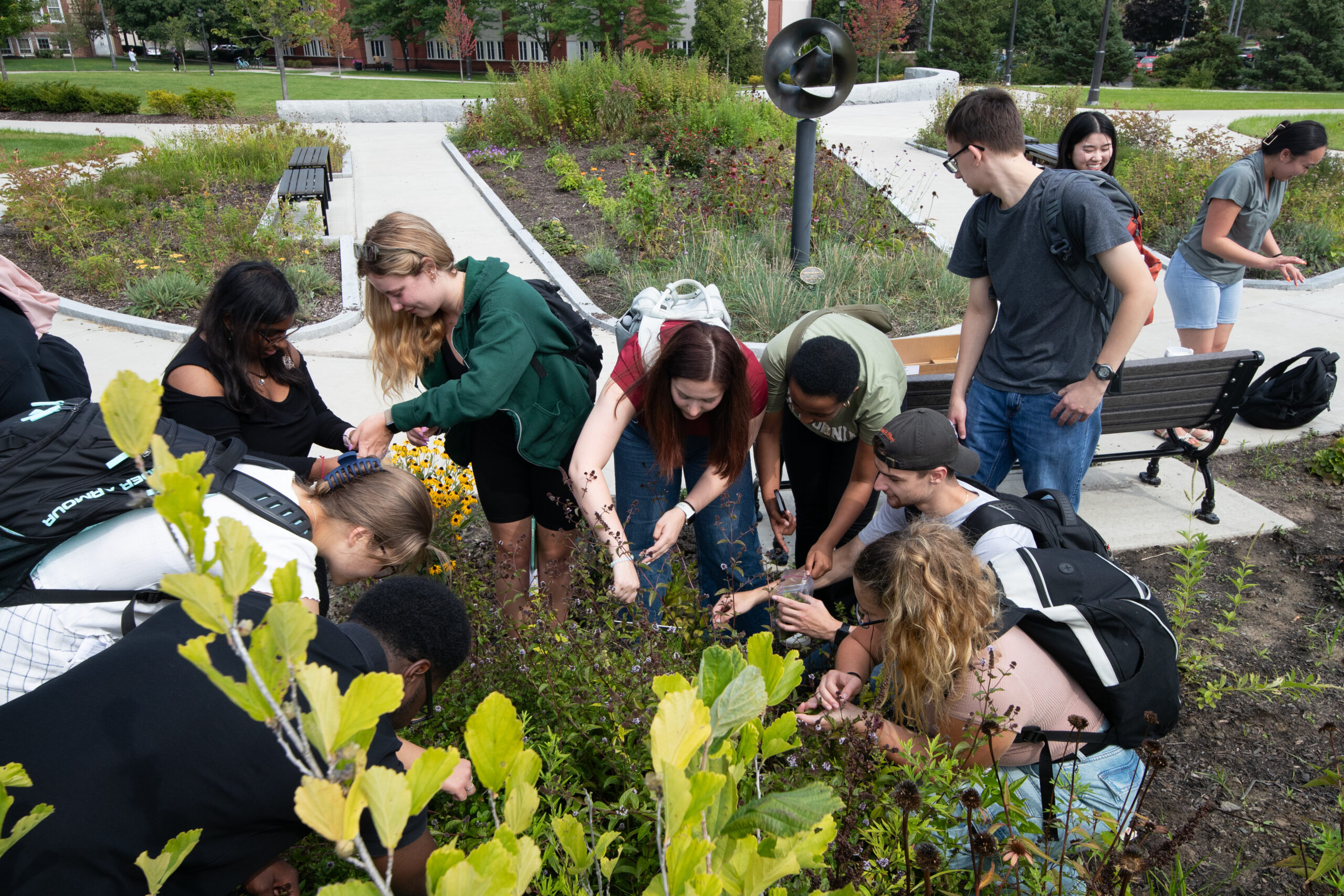 Students dressed professional stand in front of Gozzo student center